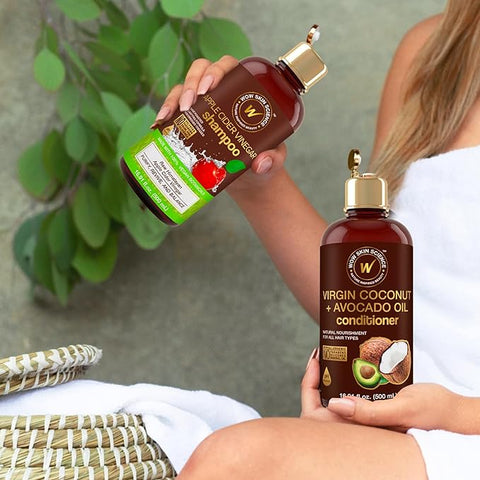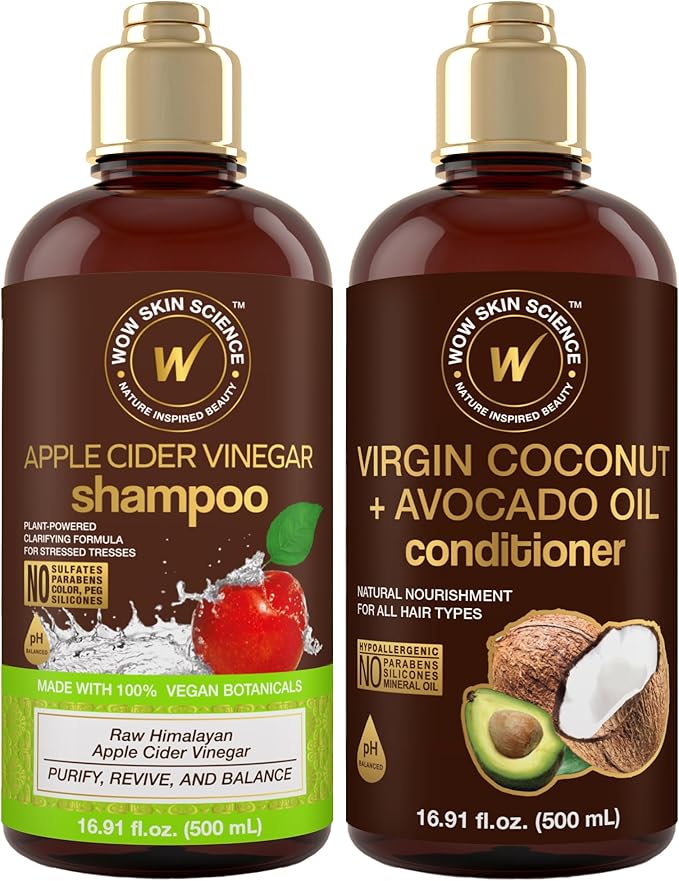 WOW Apple Cider Vinegar Shampoo and WOW Coconut Avocado Oil Conditioner Set - The Perfect Duo For Your Hair. Our premium shampoo and conditioner set is infused with botanicals to clarify and rebuild contains no sulfates, parabens, or silicones and can deliver salon level results at home in weeks. 1 Apple Cider Vinegar Shampoo (17 fl oz) 1 WOW Coconut Avocado Conditioner (17 fl oz).