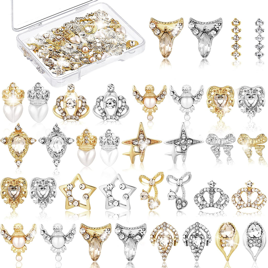 36 Pcs 3D Nail Charms Hearts Nail Charms for Nail 3D Art Gold Silver Luxury Jewels Crystal Diamonds Rhinestones Pearl Nail Gems for Beauty Manicure Nails Jewelry Making Crafts (Crown Style)