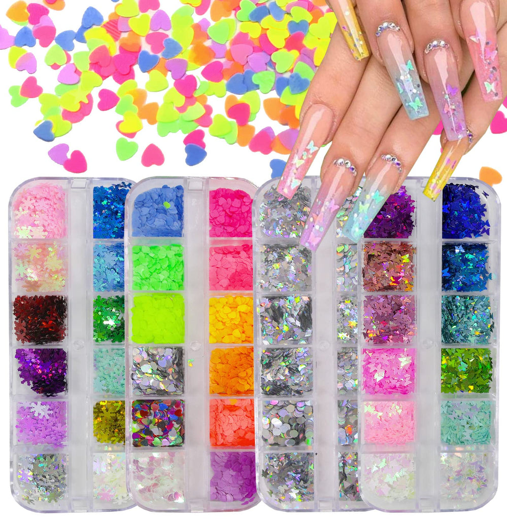 4 Boxes Holographic Butterfly Snowflakes Chunky Nail Glitter Flakes Neon Heart Sequins Confetti Resin Accesssories Manicure Tips Decorations for Nails Crafts Resin Makeup