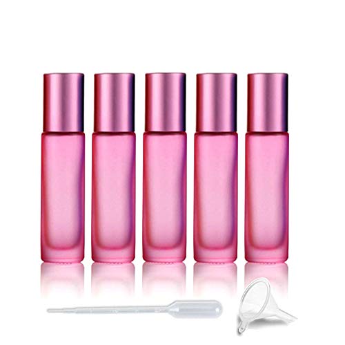 5 Pack 10ml Colorful Frosted Glass Roll On Bottles,Empty Essential Oil Glass Roller Bottle With Stainless Steel Roller Balls Travel Roll-On Vial with Aluminum Lids-Funnel&Pipette Include (Pink)