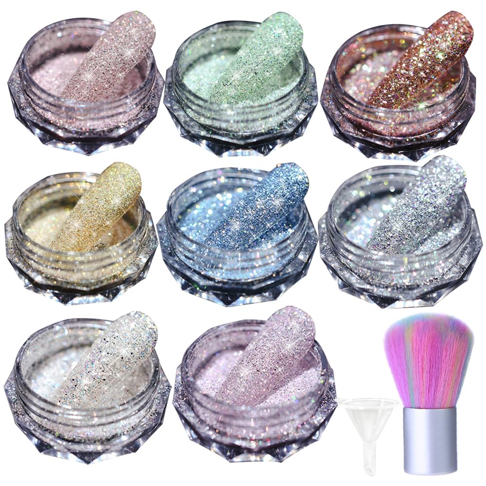 8 Boxes Nail Crystal Diamond Powder Rushed Diamond Glitter Sparkles Powders Pigment Nail Art Glitter Powder,1 Case Dip Powder Recycling Tray System Dip Case Nail Dip Container 1 Pcs Nail Powder Brush