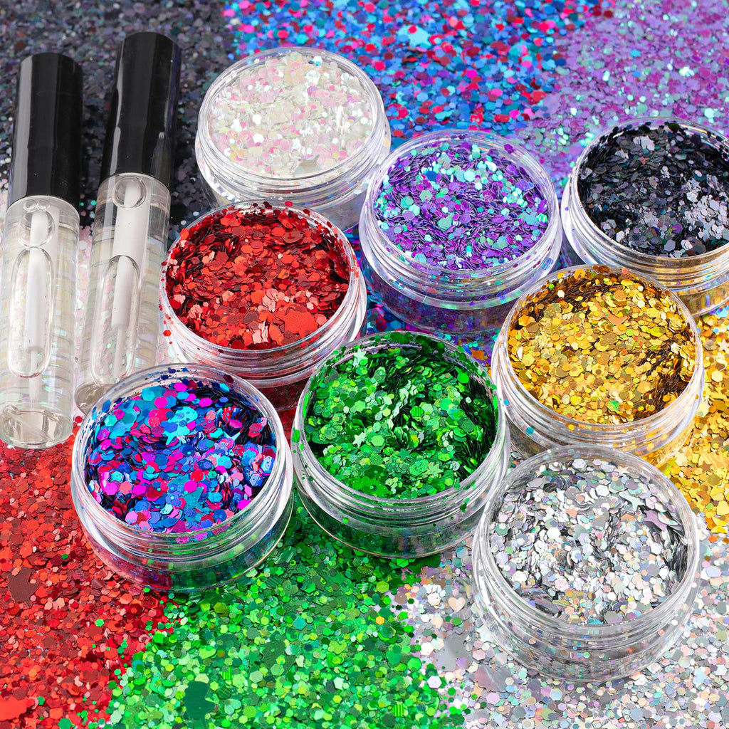 8 Colors of Holographic Chunky Glitter with Quick Dry Glue Pack 2, 8 Pots Total 80g Multi-Shaped for Body Hair Face Eyes Make-up, Nail Art and Bedazzling in Party/Concert/Events Glitter