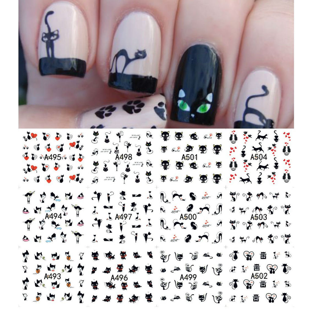 AKOAK 12 Sheets Cute Cat Pattern Watermark Designs Nail Art Stickers Water Transfer Decals Beauty Nails for Nail Art Design