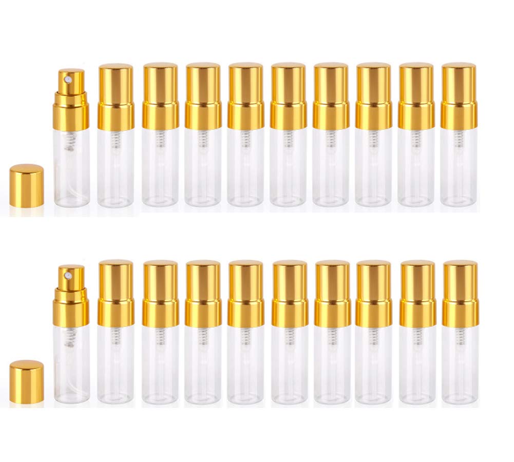 Atomizer Glass bottle Spray Bottle, 3ml Refillable Fragrance Perfume Mini Fine Mist Travel Small Empty Bottle Fragrance Clear Bottle With Aluminum Nozzle,20pcs (Gold)