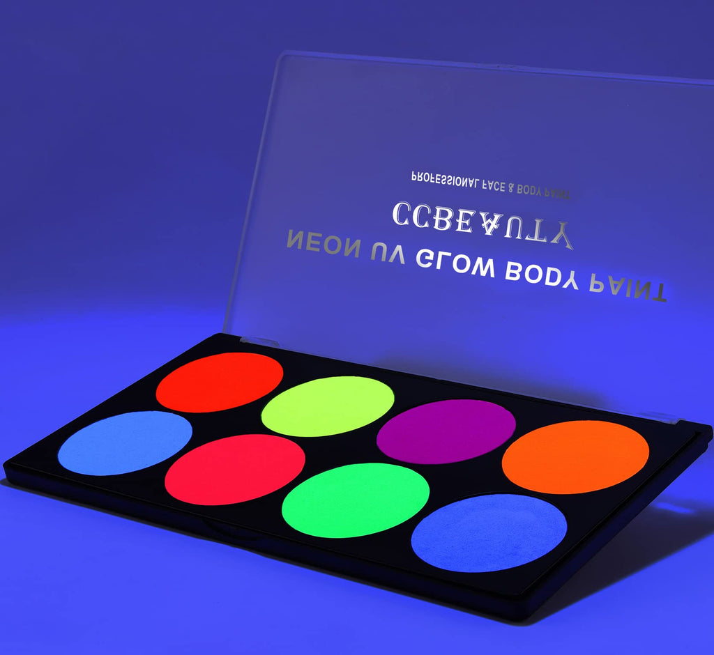 CCbeauty Pro Large UV Glow Face Body Paint Palette, 8 Neon Glow In The Black Lights Makeup, Water Based Activated Eyeliner Painting Palette, Non-Toxic Washable for Kids Adults, Halloween Costume Masquerades Club Makeup