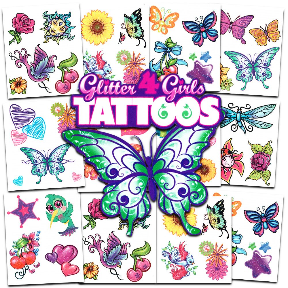 Crenstone Glitter Tattoos ~ 50 Dazzling Designs ~ Hearts, Butterflies, Flowers, and More Temporary Tattoos for Girls. These high quality Glitter Temporary Tattoos are the perfect costume accessories, party favors or everyday fun activity. With a total of 50 glitter temporary tattoos, the fun can last for hours for everyone. These glitter tattoos feature a broad assortment of artwork including butterflies, stars, flowers, birds, fairies, food, and more. Glitter tattoos are fun, fast to apply, easy to remove. FD&C Approved Ingredients. MADE IN THE USA.