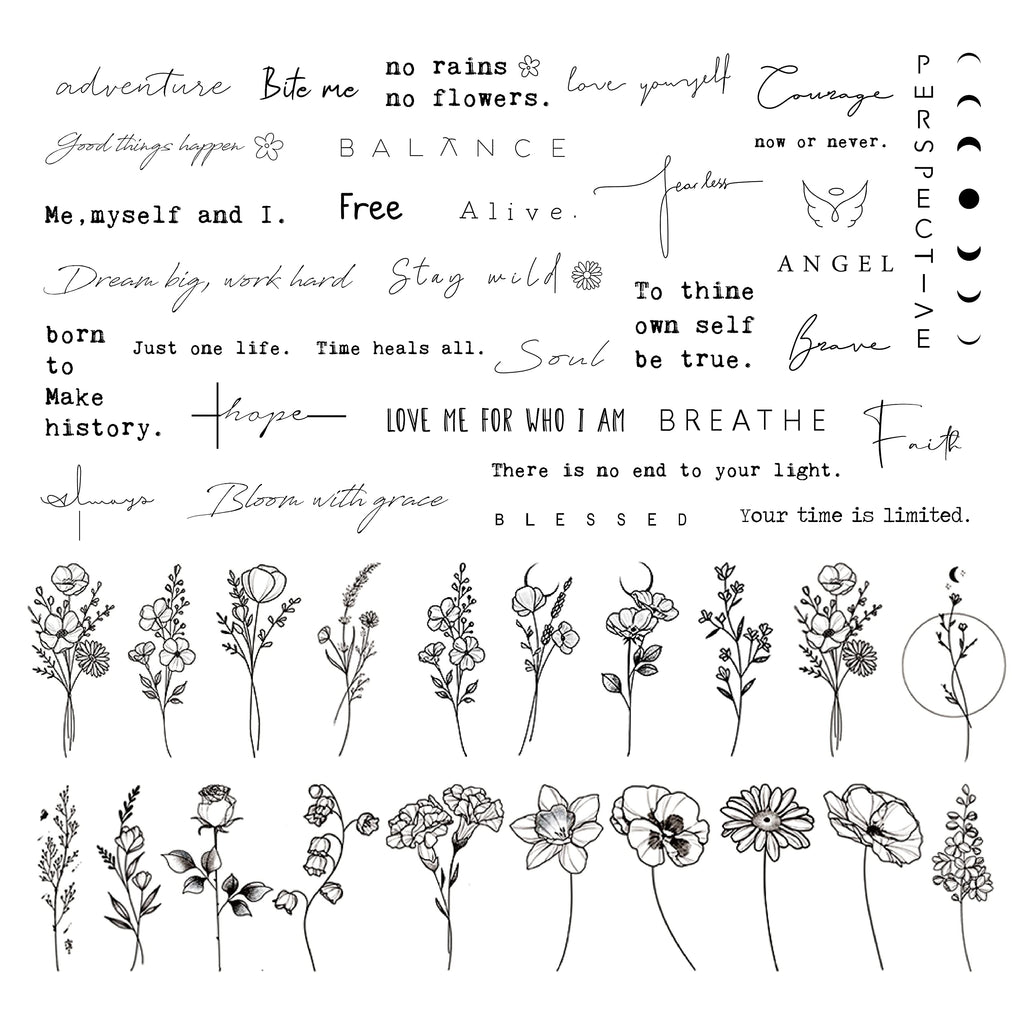 DIVAWOO Realistic Temporary Tattoo - 60 Sheets Tiny Fake Tattoos, 40 Pcs Inspirational Words Tattoo, 20 Pcs Wild Flower Floral Bouquet Stickers for Adult Women Face Body Hand