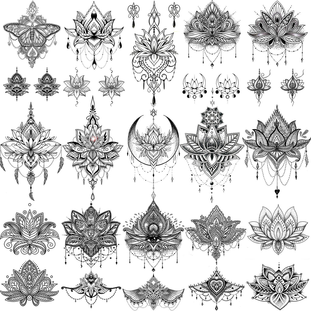 EGMBGM 15 Sheets Sexy Black Lotus Temporary Tattoos For Women Fake Jewelry Indian Tribal Bohemia Lace Moon Moth Flowers Pendant Temp Tattoos Temporary Sticker For Girls Arm Neck Chest Breast Tatoos Boobs