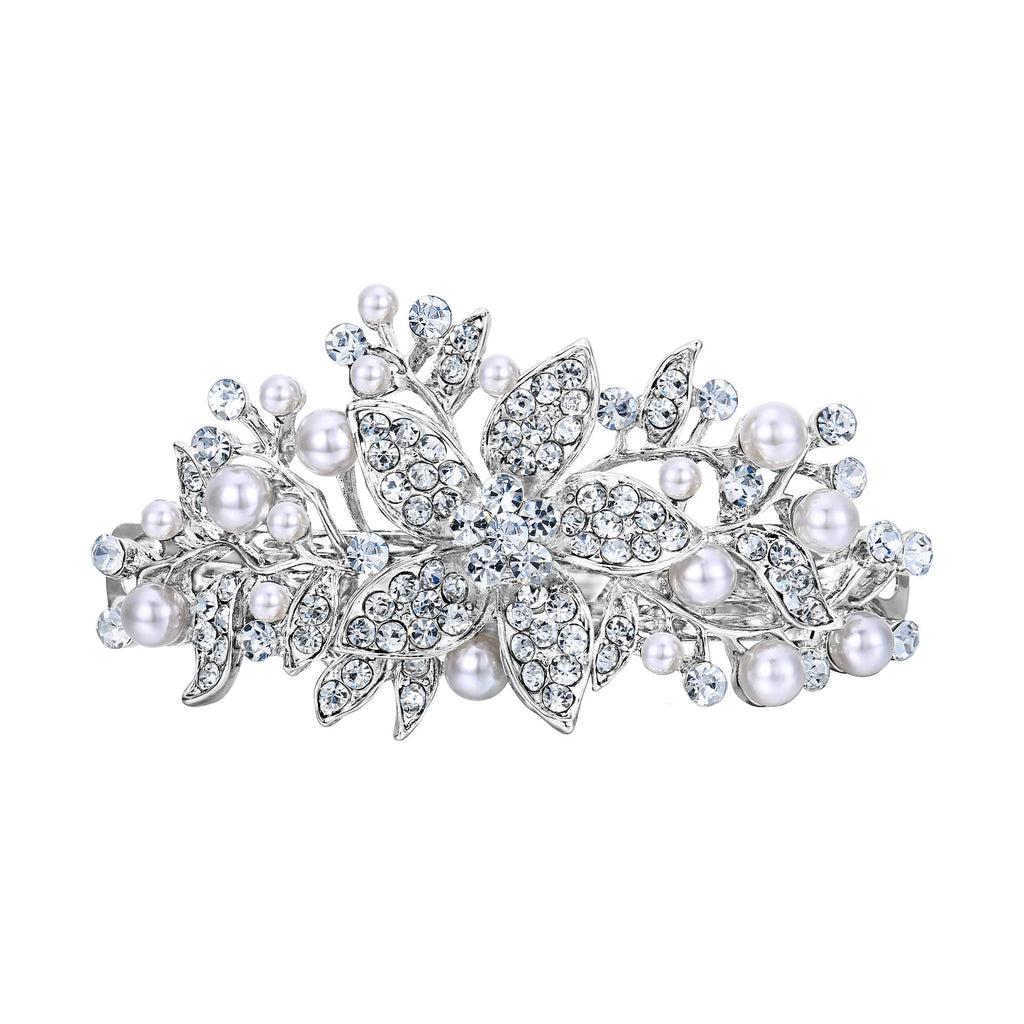 EVER FAITH Austrian Crystal Bridal Hibiscus Cream Simulated Pearl Hair Clip Barrette Clear Silver-Tone