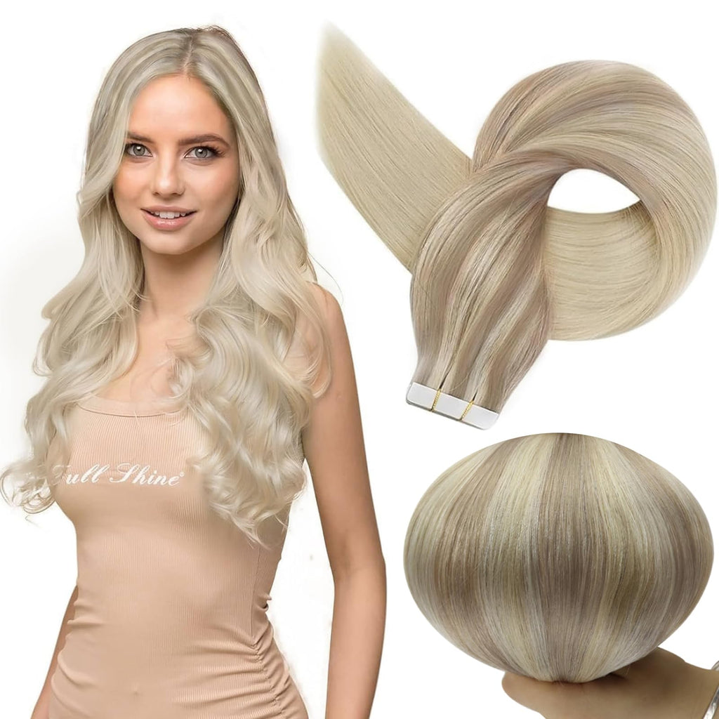 Full Shine 14" 20 Pcs 50 Gram Per Package Dip Dyed Hair Nordic Balayage #18 Ash Blonde Fading to Blonde #22 and #60 Remy Real Hair of Pu Tape in Human Hair Extensions