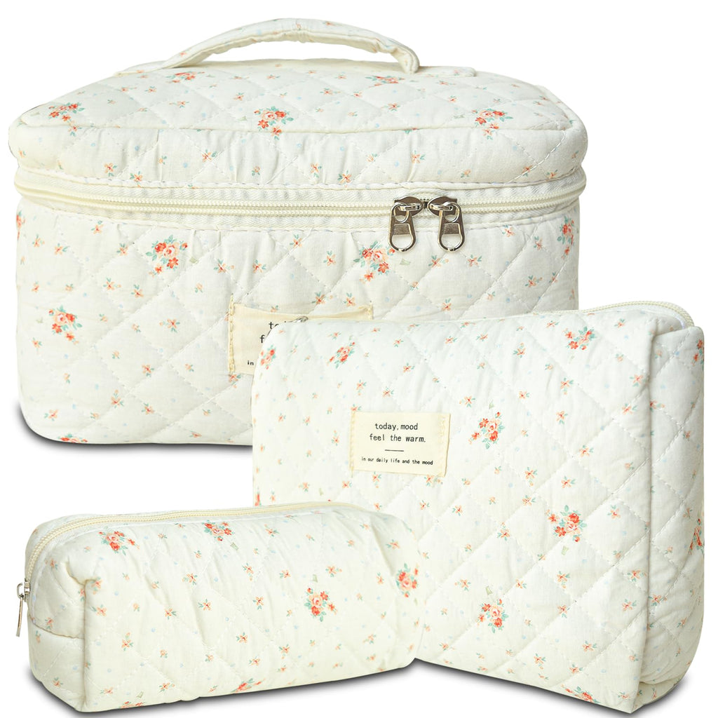 GISMTR 3Pcs Cotton Quilted Makeup Bag Large Travel Cosmetic Bag Coquette Makeup Pouch Cute Aesthetic Floral Toiletry Bag for Women Girls, flower-G