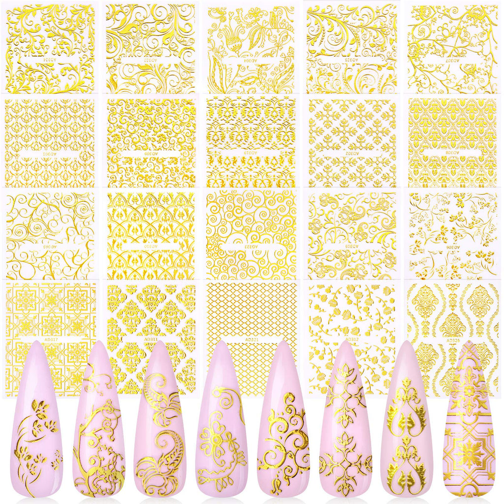 Gold Flowers Nail Art Sticker, KISSBUTY 20 Sheets Metallic Flowers Vine Nail Decals 3D Flower Lace Nail Adhesive Stickers Leaves Nail Art Decor Gold Floral Nail Decor Manicure