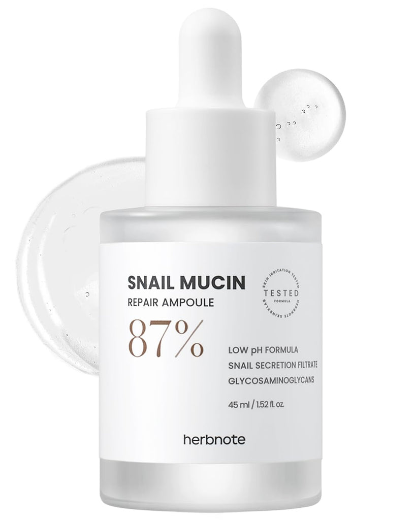 HERBNOTE Snail Repair Ampoule 45ml (1.52 fl.oz.) - 85% Snail Mucus Filtrate Contains Moisturizing & Pore Tightening Facial Ampoule, pH5.2 Hypoallergenic Soothing Formula, Paraben Free