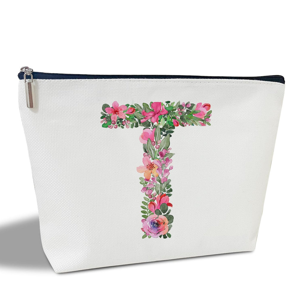 Initial Letter T Gifts for Women Mom Friend Besties Sister, Flower Monogrammed Makeup Bag, Cosmetic Travel Bag with Zipper for Mother's Day Wedding Graduation, Bride Bridesmaid Pouch Toiletry Bag - 20, White