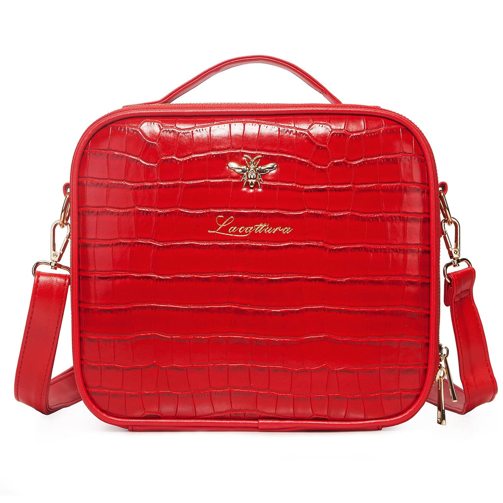LACATTURA Travel Makeup bag, Leather Makeup Train Case Cosmetic Organizer for Makeup Brushes Toiletry Jewelry Digital Accessories, Portable Artist Storage Bag With Shoulder Strap for Women lady