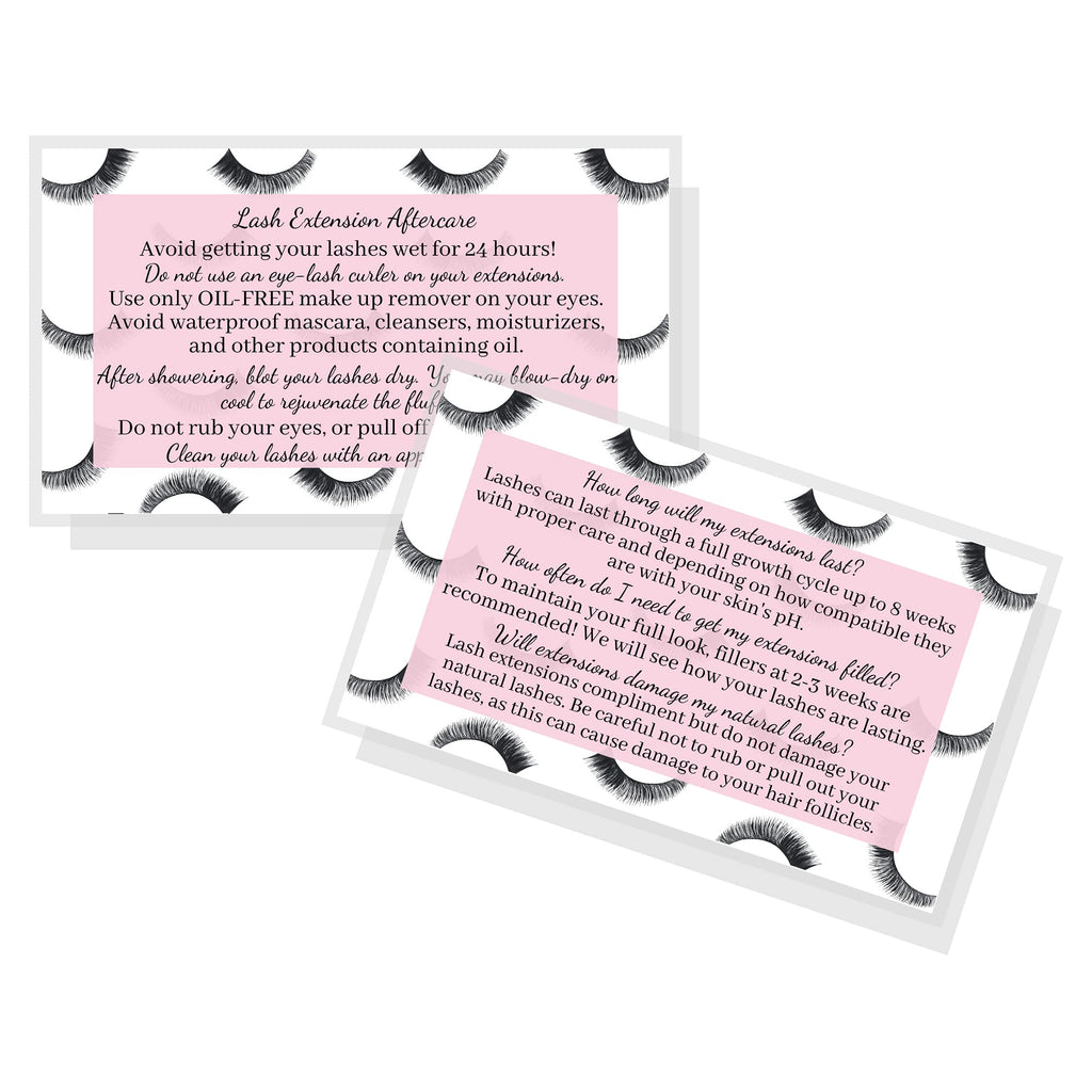 Lash Extension Aftercare Instructions Cards | Package of 50 | False Lash print with Pink Inlay Design Double Sided Size 3.5 x 2" inches After Care (2-3 Week Fillers)