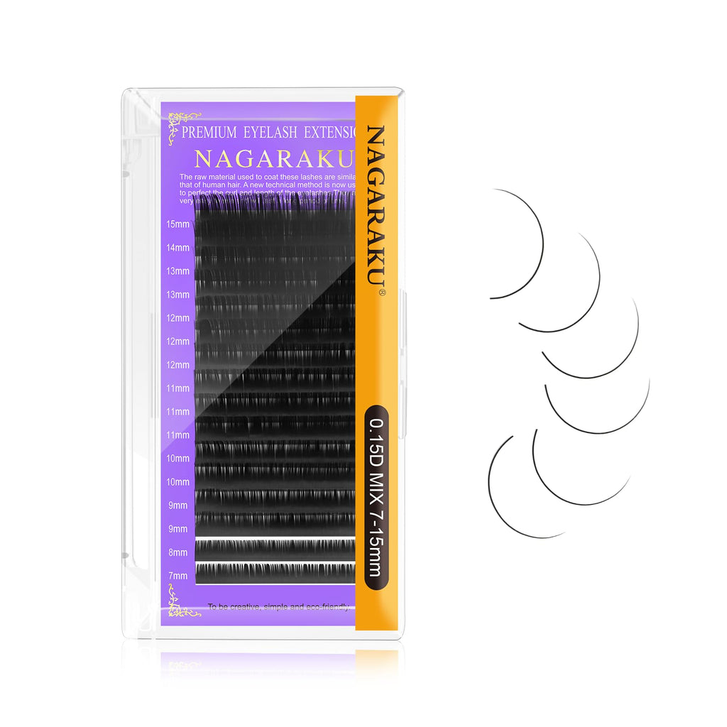 NAGARAKU eyelash extensions, professional for eyelash artist, lash salon. Thickness: 0.03 0.05 0.07 0.10 0.15 0.20 Curl: C D Length: 8mm to 17mm, 7-15mm Mix Color: Matte black