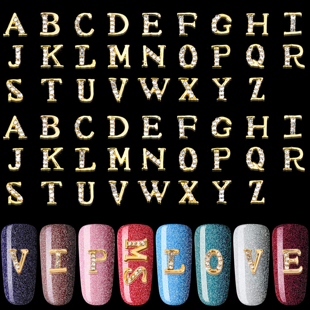 PAGOW 52pcs Gold Rhinetone Letters Nail Stud Stickers, 3D Nail Rhinetone Capital Nail Stud Decoration DIY Designs for Women Girls