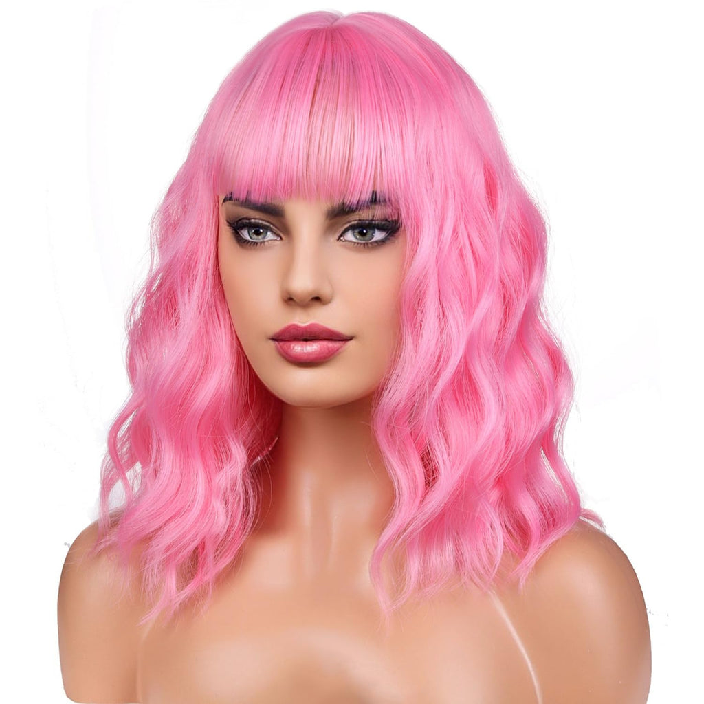 Pink: RightOn 14’’ Short Curly Women Girl’s Charming Synthetic Wig with Air Bangs Wig Cap Included (Pink)