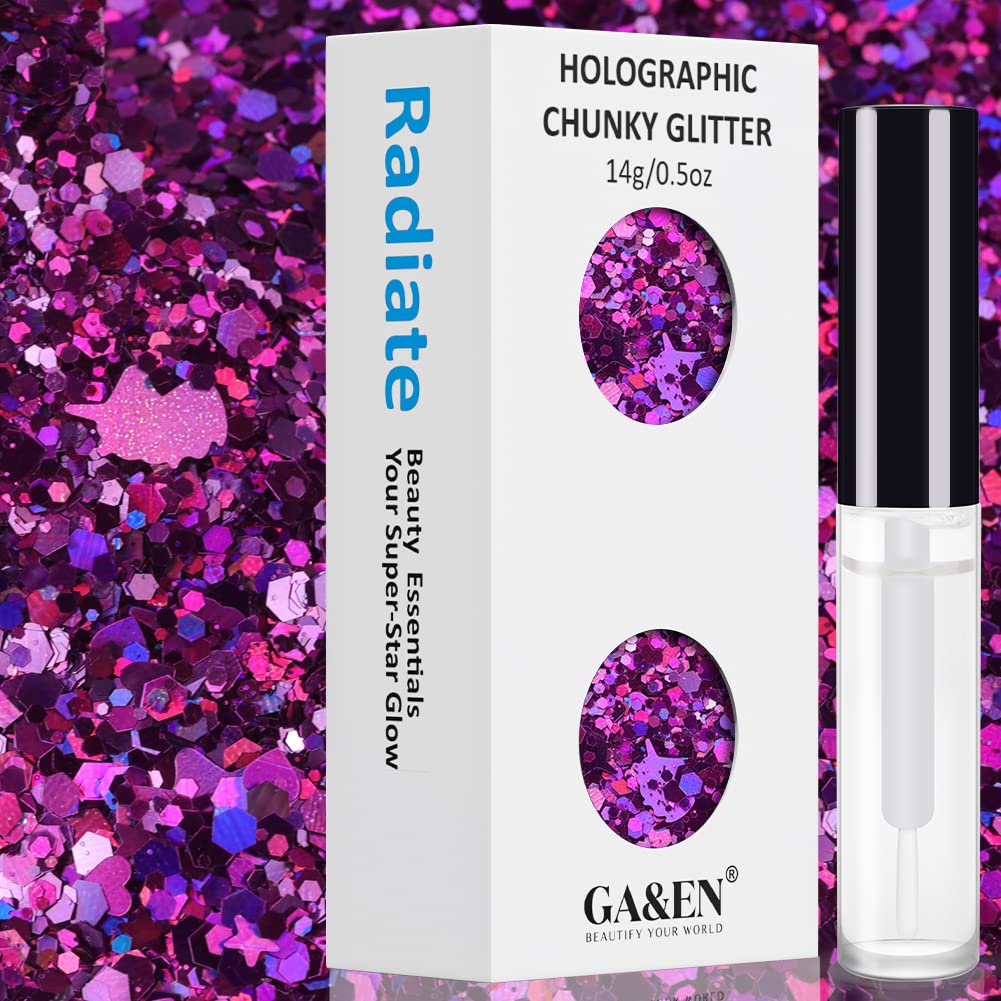 Purplish Red Holographic Chunky Glitter Cosmetic Body Hair Face Nail for Festival Carnival Concert Party Beauty Rave Accessories Different Sizes&Shapes 2 Pots (14g/0.5oz)