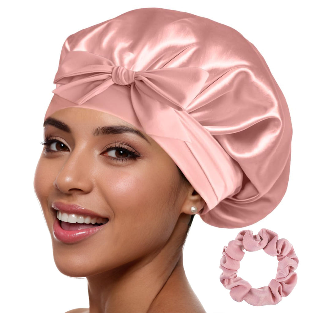 Silk Bonnet – 100% Mulberry Silk Sleep Cap Breathable & Adjustable Sleeping Caps Non Slip Silk Hair Wrap Women Night Cap for Curly Hair with Elastic Tie Band Silk Satin Turban (Pink)
