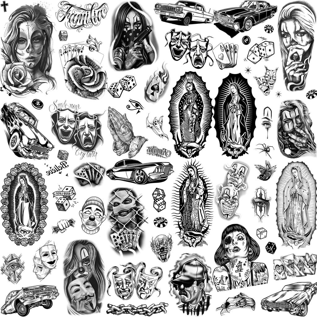 TASROI 6 Sheets Large Chicano Temporary Tattoos For Men Women Adult, Chicana Guadalupe Gangster Temp Fake Tattoos Prisoner Day of the Dead, Halloween Mexico Tattoo Stickers Tatuajes Temporales Autocolante