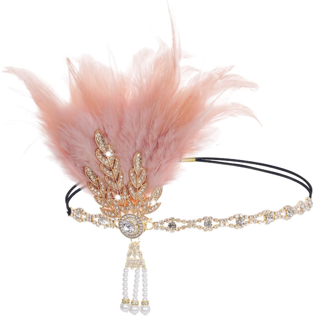 Tongcloud 1920s Flapper Feather Headband Roaring 20s Gatsby Headpiece Women's 1920s Headband Flapper Feather Headpiece (Pink)
