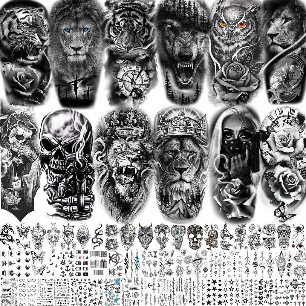 VANTATY 69 Sheets 3D Realistic Tiger Lion Temporary Tattoos For Women Forearm Men Arm, Half Sleeve Wolf Owl Skull Skeleton Waterproof Fake Tattoos For Adults Thigh, Black Animal Bulk Tattoo Sticker