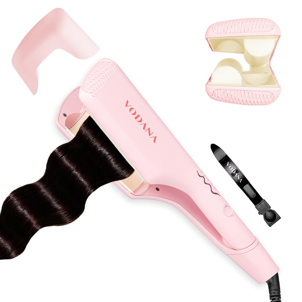 VODANA Professional Triple Flow Ceramic Hair Waver, Easy Beach Wave, Embedded, Light Double Barrel Wave Iron for Wide Deep Waves (1.25 inch, Pink Vanilla)