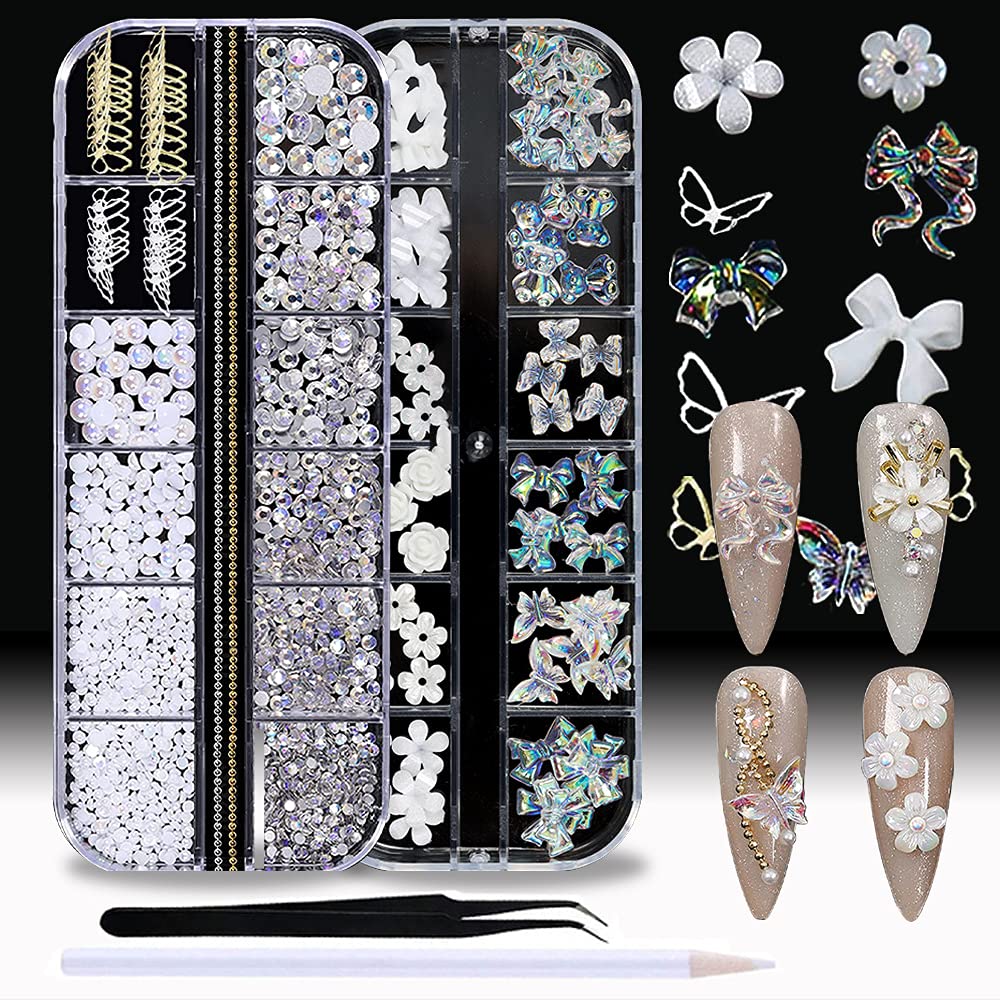 WOKOTO 2 Box 3d Nail Charms For Nail Art 3d Nail Rhinestones For Acrylic Nails Mix Shapes 3d Butterfly Nail Art Rhinestones Pearls For Nails 3d Flowers For Nails Holographic Nail Bows Bears Set